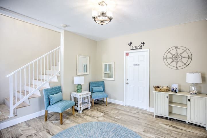 The indoor living area includes a sleeper sofa and loveseat with a large smart TV between full glass sliders that frame a gorgeous view of the Atlantic Ocean. Just off the open living area, conveniently located between all bedrooms, are the new large capacity front load washer and dryer.