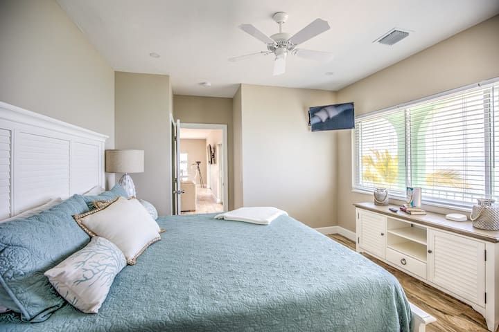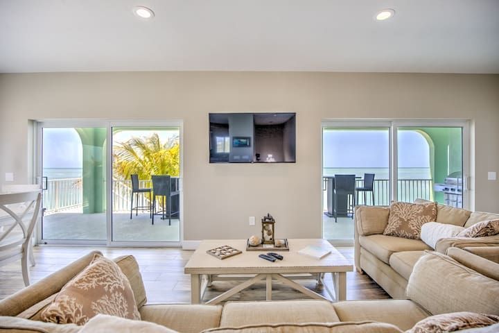 All bedrooms and bathrooms are recently remodeled with new furniture, mattresses and linens, tile baths, marble countertops, and plenty of soft towels. The Master Bedroom faces the water with a spectacular oceanfront view, a luxurious king bed, and a private bathroom suite with 60" vanity and large oceanfront walk-in shower. Bedroom 2 includes a Queen Bed, wonderful water / pool view, and another private bathroom with a large walk in shower. Bedroom 3 provides a very comfortable King Bed and shares a bathroom with bedroom 4. Bedroom 4 includes two comfortable twin beds, water / pool view, and shares a bathroom with bedroom 3. The 3rd bathroom offers a full tub / shower combination.