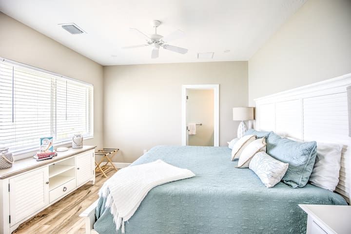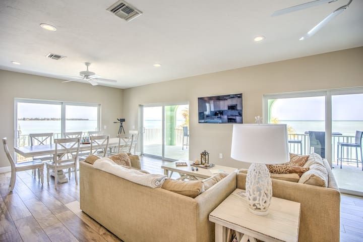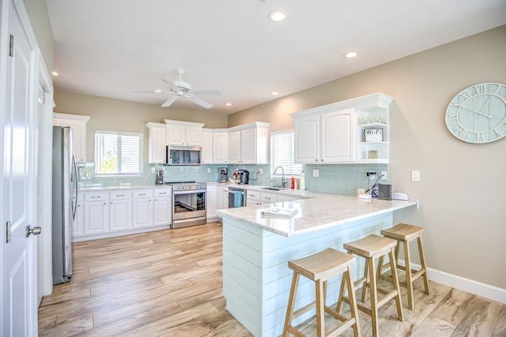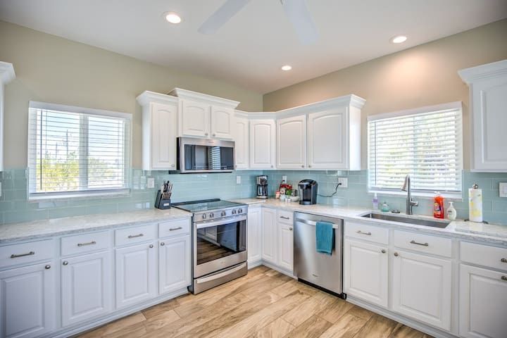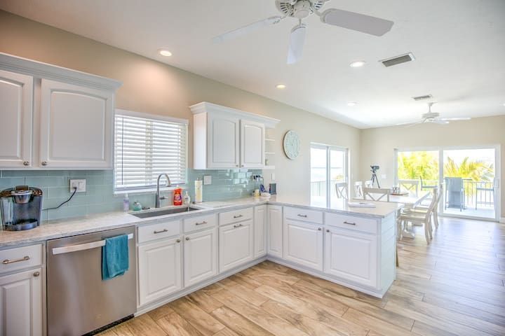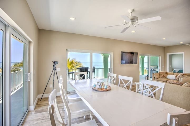 The home features a fully stocked kitchen with all new stainless appliances to accommodate family meals at a large dining table overlooking the open ocean. We offer full-sized pots and pans and Keurig coffee makers, blenders, plenty of glasses for wine, beer, tropical drinks, and both formal and casual dishware for indoor or outdoor dining with every serving utensil you could ask for. A gas grill is located just off the dining area, and raised bar-style outdoor seating provides for stunning sunrises and sunsets. The 3/4 wrap around balcony affords 180 degrees of private open water views!